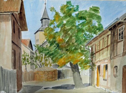 Das von Albert Riemann (Kassel, Patenonkel von Ilse Range) 1959 gemalte Bild zeigt den Blick zum Kirchturm über die Schmidtgatze, links Haus Düster, rechts Haus Erkelenz (heute Müller). Das Bild wurde von Annemarie Berndt zur Verfügung gestellt.