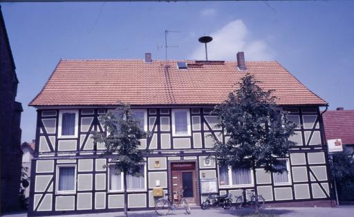 Dieses Gebäude neben der Kirche hatte seit seiner Errichtung 1803 viele Bestimmungen. Nach der Gebäudeinschrift wurde das Haus als Schule erbaut. Während des Russlandfeldzugs Napoleons 1813 diente es wegen seiner Lage an der Holländischen Straße als Lazarett. Nach dem Neubau des Schulgebäudes am Friedenshügel 1951 zog das Bürgermeisteramt der damals noch selbständigen Gemeinde Westuffeln dort ein, es wurde für rund zwanzig Jahre zum Rathaus. Nach der Gebietsreform Anfang der 1970er Jahre verblieb das Ortsvorsteherbüro im Haus, zusätzlich wurden Geschäftsräume an die Post und die Stadtsparkasse Grebenstein vermietet. In der Poststelle gab es auch einen öffentlichen Fernsprecher, die Gebühren waren am Schalter zu bezahlen. Schließlich wurde das Gebäude verkauft und wird heute als Wohnhaus genutzt. Das Foto wurde von Anton Muck aufgenommen und von Erni Muck zur Verfügung gestellt.