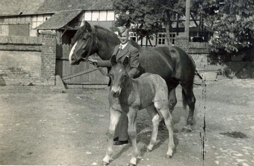 Das Foto aus den 1930er Jahren zeigt Hans Berndt auf dem ehemaligen Posthof der Familie Berndt (später Range, Bethmann, heute Klos) in der Holländischen Straße mit Stute und Fohlen. Die Familie Berndt betrieb über viele Generationen die Poststelle in Westuffeln, die eine von drei Poststationen an dem Postkurs zwischen Warburg und Kassel war. Sie erhielt von den Westufflern den Beinamen "Postmeisters". Hans Berndt fiel wie sein Bruder Gustav (Gustel) im 2. Weltkrieg. Im Hintergrund ist das Wohnhaus (rechts), die ehemalige Schmiede (Mitte) und die Scheune (links) der Familie Leimbach zu erkennen. Das Gebäude war vor dem im 19. Jahrhundert neu gebauten Posthof die Poststation von Westuffeln gewesen. Nach dem Neubau siedelte sich dort ein Hufschmiedemeister an und beschlug dort die Pferde, die an der Poststation gewechselt wurden. Das Foto wurde von Harald Bethmann zur Verfügung gestellt.