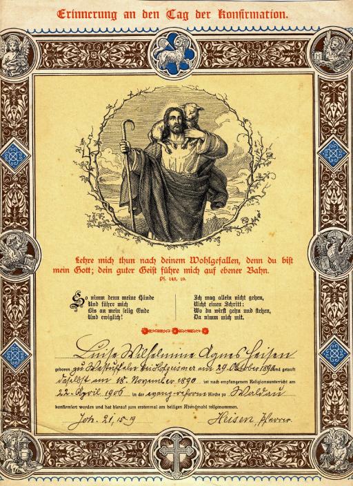 Das Foto aus den 1930er Jahren zeigt Hans Berndt auf dem ehemaligen Posthof der Familie Berndt (später Range, Bethmann, heute Klos) in der Holländischen Straße mit Stute und Fohlen. Die Familie Berndt betrieb über viele Generationen die Poststelle in Westuffeln, die eine von drei Poststationen an dem Postkurs zwischen Warburg und Kassel war. Sie erhielt von den Westufflern den 1906 konfirmierte Pfarrer Carl Heisen seine Tochter Luise in der Kirche in Westuffeln und stellte ihr eine Konfirmationsurkunde aus. Früher durfte man erstmals zur Konfirmation am Abendmahl teilnehmen, was die Urkunde auch ausweist. Die Urkunde wurde von Marianne Wolff zur Verfügung gestellt.