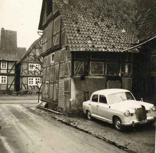 Das Foto aus der Schmidtgatze (Schmiedegasse, heute Freiherr-vom-Stein-Straße) zeigt das alte Haus der Familie Keuch/Leimbach an der Holländischen Straße, das im Januar 1967 abgerissen wurde. Die Familie Keuch betrieb hier über viele Generationen eine Hufschmiedewerkstatt, hauptsächlich für die Pferde, die in der auf der anderen Straßenseite gelegenen Remise des Sternhofs Heuser untergebracht waren. Die Familie Leimbach heiratete ein und aus der Schmiede wurde eine Stellmacherei. Vor dem Haus steht ein Mercedes 220. Das Wohnhaus wurde nach dem Abriss des alten Hauses neu gebaut, aus der Stellmacherwerkstatt wurde eine Landmaschinenwerkstatt. Das Foto wurde von Martha Friedrich zur Verfügung gestellt.