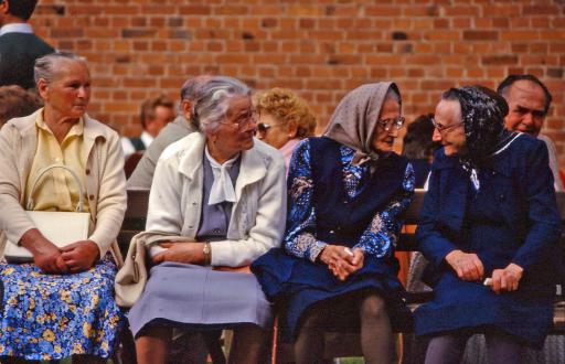Dieser Schnappschuss zeigt Besucher des Dorffestes der Vereinsgemeinschaft Westuffeln an der ehemaligen Tränke 1987. Zu erkennen sind von links: Christine Pitterle, Marie Sedlack, Adelheid Lang, Agnes Adenbeck und im Hintergrund Georg Engelbrecht. Das Foto wurde von August Düster zur Verfügung gestellt.