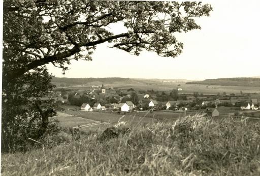 Vom noch unbebauten Mühlenberg in Westuffeln aus zeigt diese Aufnahme den Dorfkern von Westuffeln ca. 1960. Im Hintergrund ist der Mühlenberg von Meimbressen zu erkennen, rechts das Loh. Das Foto wurde von Carsten Engelbrecht zur Verfügung gestellt.