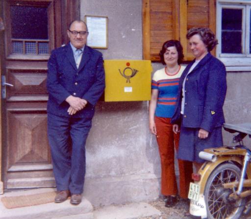 Vor der früheren Poststelle in Westuffeln im Haus Leimbach an der Kasseler Straße stehen die Postbediensteten (von links) Fritz Engelbrecht ("Post Fritz"), Margret Erkelenz und Elisabeth Kampe. Das Foto wurde von Claus Engelbrecht zur Verfügung gestellt.