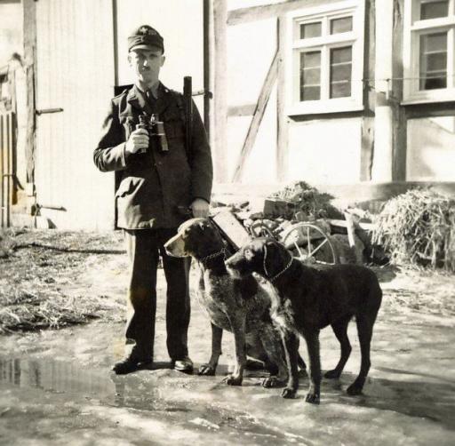 Förster Christian Germeroth mit Hunden vor seinem Haus in der heutigen Freiherr-vom-Stein-Straße. Das Foto wurde nach einem Hochwasser der Tränke aufgenommen. Die Tränke trat regelmäßig über die Ufer und überschwemmte das "Faule Loch": Einen Teil der heutigen Freiherr-vom-Stein-Straße und den Mühlenweg. Das Foto wurde von Dora von Starck zur Verfügung gestellt.