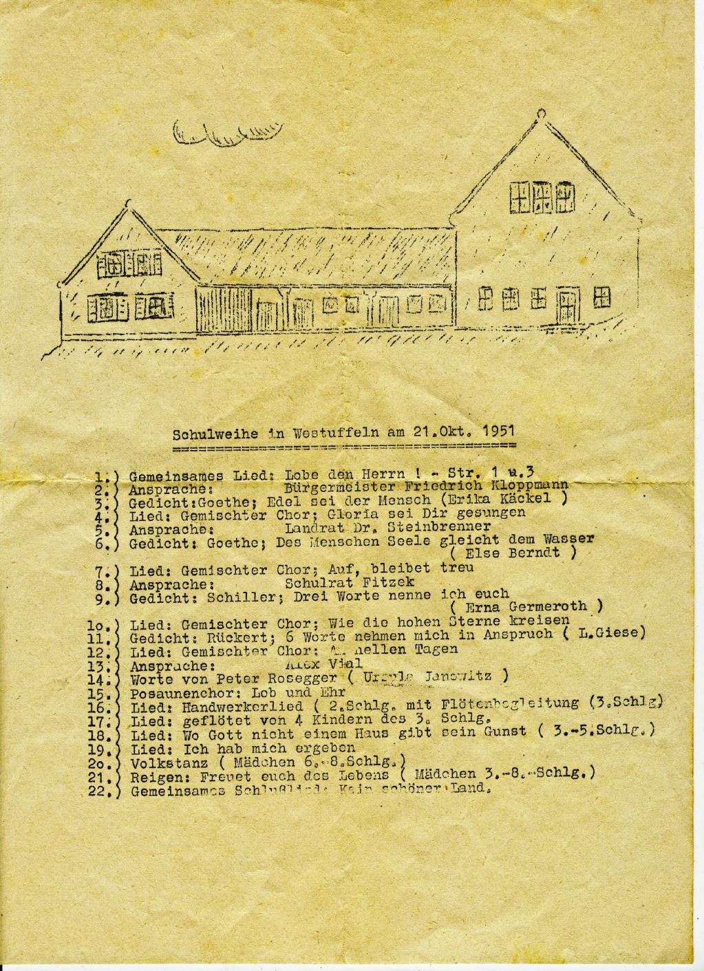 Die Abbildung zeigt das Programm der Schuleinweihung 1951. Das Gebäude löste die alte Schule am Kirchplatz und die kleine Schule an der Holländischen Straße ab. Es wurde aber nur 15 Jahre lang als Schulgebäude genutzt. Heute ist dort die Kindertagesstätte Regenbogenhaus, das Dorfgemeinschaftshaus und das Ortsvorsteherbüro untergebracht. Das Programm wurde von Edmund Pfläging zur Verfügung gestellt.