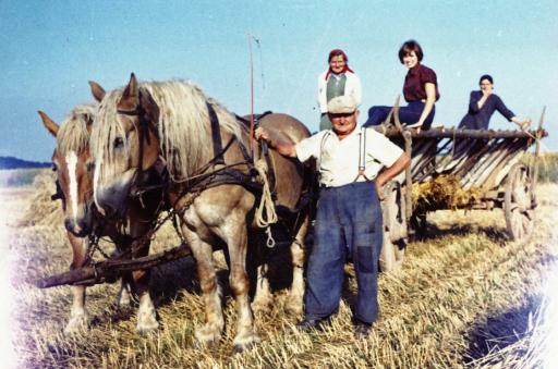 Erntefuhrwerk der Familie Düster in den 1960er Jahren mit Pferdegespann und Leiterwagen. Vorn steht Gustav Rothe, auf dem Wagen sind von links Marie, Katja und Auguste Düster zu erkennen. Das Foto wurde von Alice Wagner zur Verfügung gestellt.