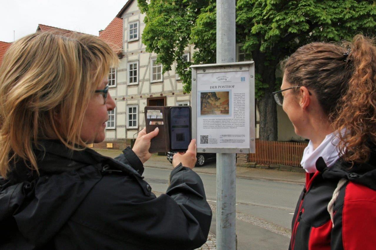 Neben den geschichtlichen Informationen wurden bei dem Dorfrundgang auch die neu gestalteten Dorfschilder eingeweiht. Sie zeigen aus der Position des Fotografen alte Dorfansichten, die sich im Laufe der Zeit verändert haben. Die hochdeutschen Erläuterungen auf den Schildern sind jetzt neu über einen QR-Code in der Westuffelner Mundart, dem Westüüfelschen Platt, hörbar. Diese neue Funktion wurde auch gleich ausprobiert. Über 20 Vereinsmitglieder hatten sich im Vorfeld daran beteiligt, die entsprechenden Texte für die Audio-Dateien zu sprechen. Die Schilder sind als Rundweg angelegt; auf jedem Schild ist angegeben, wo das vorherige und das nächste Schild zu finden ist.