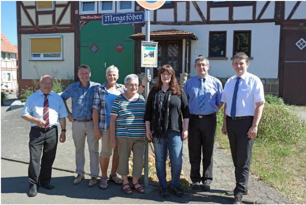 Vor dem historischen Straßenschild der "Mengeföhre" in der heutigen Grebensteiner Straße v. l.: Klaus-Peter Vogt (Stadtsparkasse Grebenstein), Bürgermeister Maik Mackewitz, Hilleburg Brede, Anna Finis und Tamara Waschke-Rüddenklau (Geschichtsverein Westuffeln), Dietmar Herborth und Martin Thöne (Raiffeisenbank eG in Westuffeln)